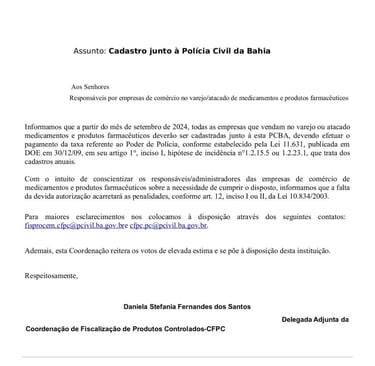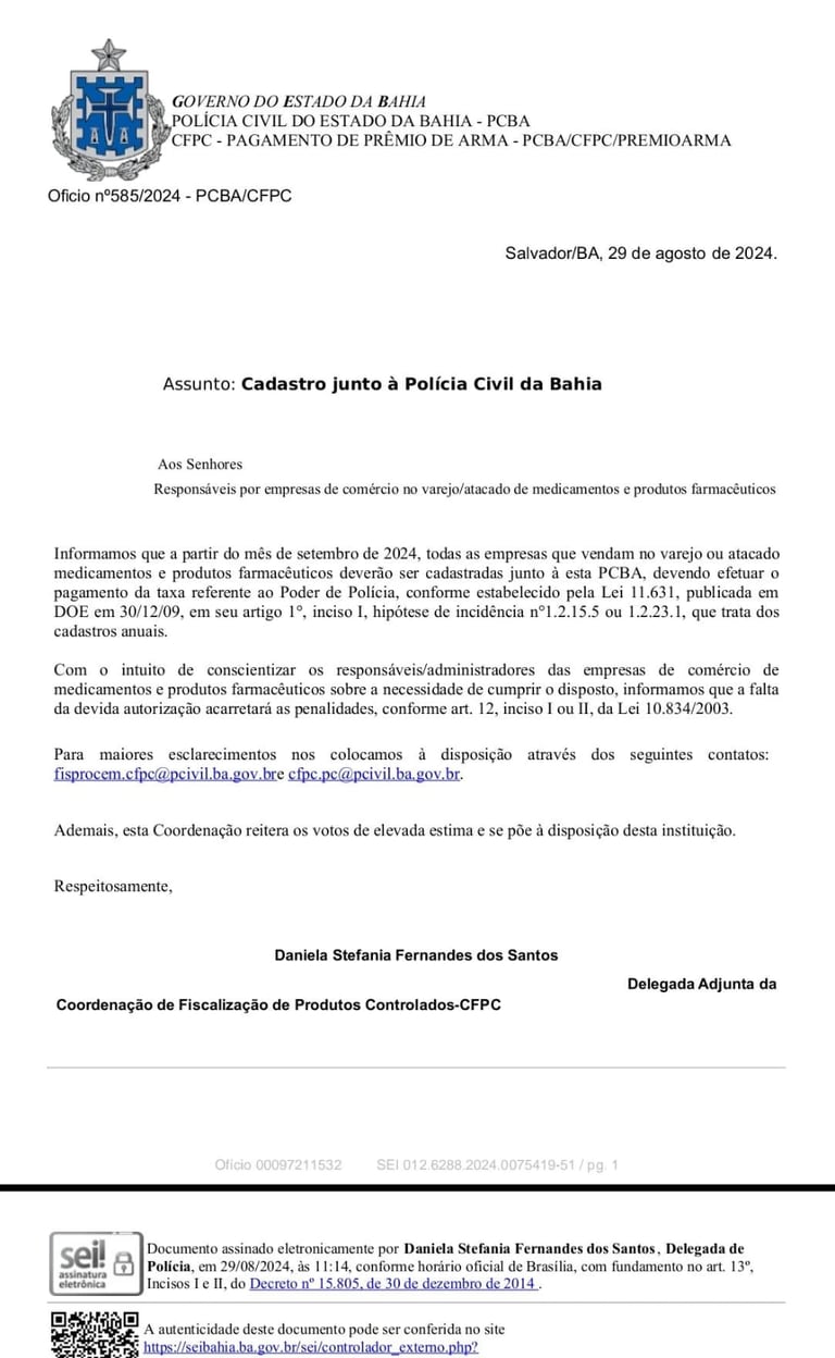 Com relação à cobrança da taxa de "Poder de Polícia ", Cadastro Junto a Polícia Civil, pela Polícia Civil do Estado da Bahia, venho informar que tivemos uma reunião com Setor Jurídico da Fecomercio-Bahia no sentido de tomarmos providências sobre o assunto. Solicitamos aos Srs Proprietários de Farmácias do Estado da Bahia que por enquanto não paguem essa taxa, pois a mesma é inconstitucional. Estamos tomando as devidas providências