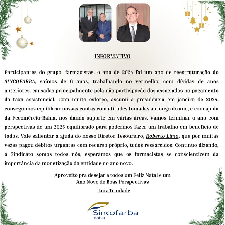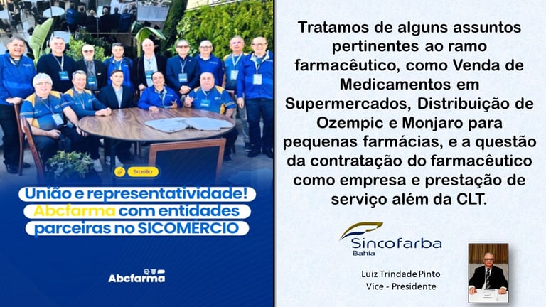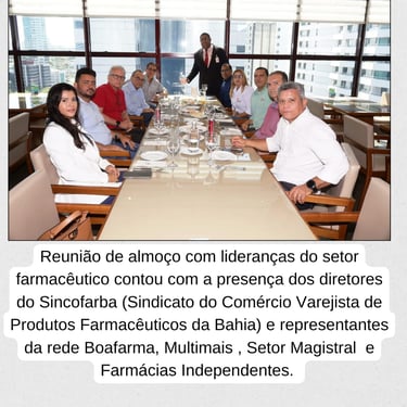 Aos sete dias do mês de Agosto de 2024, reuniram-se os Diretores do Sincofarba, juntamente com alguns Farmacistas, para tratarmos de Assuntos inerentes às demandas do setor farmacêutico do estado da Bahia. Presentes os seguintes diretores e farmacistas: Luiz Trindade Pinto, Carlos de Souza Andrade, Renata Côrtes, Cláudio Andrade e Paulo Devaniê dos Santos. O presidente em exercício, Luiz Trindade Pinto iniciou a reunião agradecendo a presença de todos e passou a abordar os assuntos a serem discutidos. O primeiro assunto foi a respeito da negociação da CCT dos Farmacêuticos, onde ficou decidido a formação de uma Comissão de negociação com representantes da ABRAFARMA (Grandes Redes), Multmais, Boa Farma e Farmácias Independentes, com 1(hum) representante de cada entidade, além do Presidente em Exercício. Foram convidadas duas funcionárias da Fecomercio-Bahia, para apresentação do "CLUBE FECOMÉRCIO ", com ferramentas de interesse dos proprietários de Farmácias desse estado. Onde oferece facilidades e descontos em Serviços que serão oferecidos às Farmácias filiadas no Sincofarba.