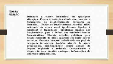 O Sindicato do comércio varejista de produtos farmacêuticos do estado da Bahia, Entidade sindical de 1º grau, com sede na Avenida Manoel Dias da Silva,1783 1º andar, sala 108 - Pituba – CEP 41830000 na cidade de Salvador, reconhecido em 30 de setembro de 1986, conforme carta sindical, da categoria econômica do comércio varejista de produtos farmacêuticos da Bahia. Sua principal função e a de defender a classe farmacista em quaisquer situações. Presta orientações desde abertura até o fechamento do estabelecimento (drogaria ou farmácia). Dispõe de Departamento Jurídico ativo, referente ás áreas cível (problemas ligados à empresa) e trabalhista (problemas ligados aos funcionários), para a defesa dos estabelecimentos farmacêuticos. Discute acordos coletivos para estabelecimento de pisos salariais em entre outros assuntos. Estamos sempre trabalhando em prol da categoria farmacista, também através de ações processuais, principalmente contra abusos de Órgãos regionais e federais. Colocamo-nos a disposição para prestas quaisquer informações de interesse farmacêuticos.