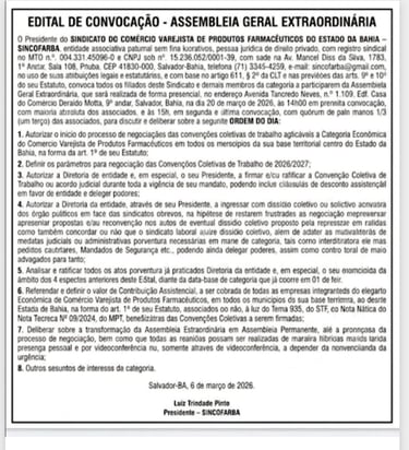 SINDICATO COM. VAREJISTA DE PRODS. FARMACÊUTICOS DO ESTADO DA BAHIA