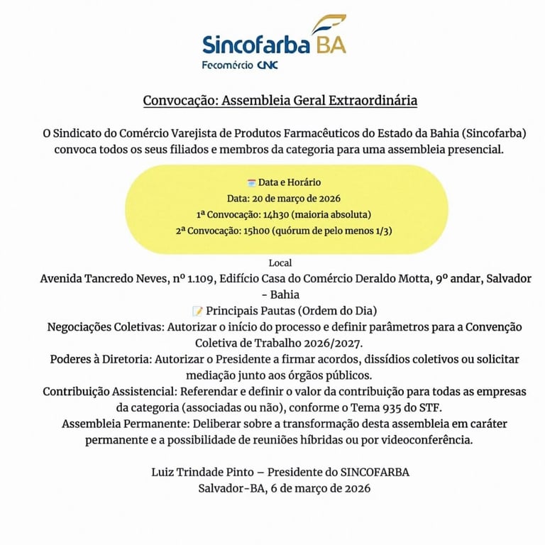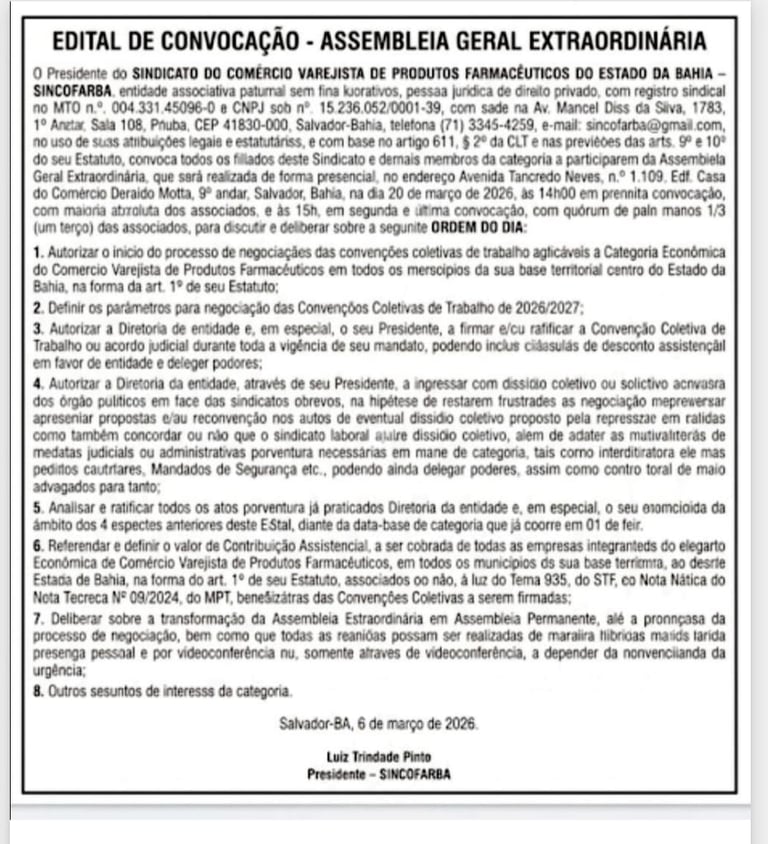 Aos sete dias do mês de Agosto de 2024, reuniram-se os Diretores do Sincofarba, juntamente com alguns Farmacistas, para tratarmos de Assuntos inerentes às demandas do setor farmacêutico do estado da Bahia. Presentes os seguintes diretores e farmacistas: Luiz Trindade Pinto, Carlos de Souza Andrade, Renata Côrtes, Cláudio Andrade e Paulo Devaniê dos Santos. O presidente em exercício, Luiz Trindade Pinto iniciou a reunião agradecendo a presença de todos e passou a abordar os assuntos a serem discutidos. O primeiro assunto foi a respeito da negociação da CCT dos Farmacêuticos, onde ficou decidido a formação de uma Comissão de negociação com representantes da ABRAFARMA (Grandes Redes), Multmais, Boa Farma e Farmácias Independentes, com 1(hum) representante de cada entidade, além do Presidente em Exercício. Foram convidadas duas funcionárias da Fecomercio-Bahia, para apresentação do "CLUBE FECOMÉRCIO ", com ferramentas de interesse dos proprietários de Farmácias desse estado. Onde oferece facilidades e descontos em Serviços que serão oferecidos às Farmácias filiadas no Sincofarba.